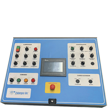 1 - Carro elevador de bobina para cargas de 3.000 a 20.000 kg. 2 - Rolo Pressor para abertura de bobina. 3 - Desbobinador motorizado com freio para cargas de 1.000 a 20.000 kg e larguras de 200 a 1.850 mm. 4 - Endireitador para larguras de 200 a 1.850 mm úteis e espessuras de 0,5 a 6 mm. 5 - Painel de comando da linha de alimentação 6 - Alimentador eletrônico para larguras 200 a 1.850 mm úteis e espessuras de 0,5 a 6 mm. 7 - Ferramenta de estampo. 8 - Painel com monitor de ferramentas para processos contínuos.